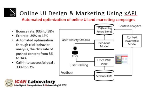 借助 xAPI 跨装置的特性搜集行为,能够掌握使用者的隐性及显性行为,凭借自适化的语意网页架构,让内容与布局分开储存,后台分析结果进行自动化调整(网页长度、设计、文案),最短时间呈现吸引访客的内容。结果 bounce rate 与 exit rate 明显下降了约40%,新页面推播点击率由 8% 提升至34%,来电成交率由 33% 提升至 53% 。(台湾大学 iCAN Lab 提供)
