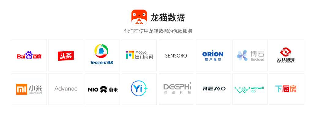 龙猫数据上线于 2016 年初,其核心业务是为 AI 及大数据领域公司提供数据采集、标注等定制化数据解决方案,服务领域涵盖图像、语音、文本、视频四个方面。目前,龙猫数据旗下拥有众包平台「龙猫众包」,包括移动端APP、PC端标注网站等。官方表示,目前用户量达到百万级,可承担千万人以上样本量,为客户节约至少 50% 数据成本,是国内可调动数据处理人员最多、结果最精准的 AI 数据服务平台。目前,龙猫数据长期合作伙伴包括:百度、腾讯、小米、今日头条、蔚来汽车、升哲、出门问问、猎户星空、Advance、图森、下厨房、深鉴、Remo、YI+、西井、博云、云从、Video++ 等一系列国内领先科技公司。