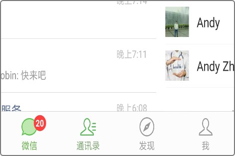 例如微信底部的四个按钮,分为两种静态显示:选中时填充色为绿色,未选中时无填充色;但是介于选中和未被选中之间是什么颜色呢?这个可以定义为一个过程色,我们可以在微信一级界面左右滑动页面观察底部按钮的变化,当即将被选中时,按钮是从轮廓慢慢变绿并且绿色逐渐加深,然后是慢慢填充绿色;当即将被取消选中时,则按钮颜色变化正好相反。