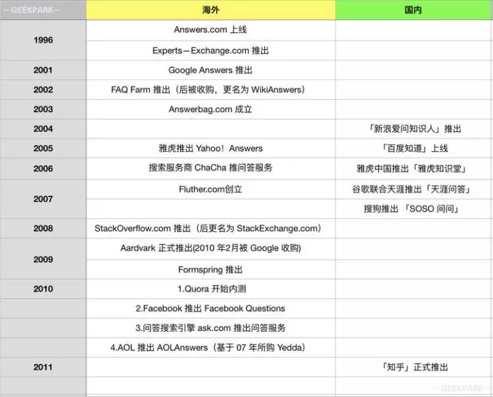互联网开始出现时,因为信息在需求和供给两端的爆发增长,海量的冗余信息催生了更精确的信息需求,问答的概念应运而生。从最早的 Answers.com 到谷歌在 2001 年尝试的 Google Answers,从 FAQ Farm(WikiAnswers 的前身)到 Yahoo!Answers,再到之后 Fluther.com,以及知乎的鼻祖 Quora;而在国内最早从 2004 年的新浪爱问知识人到 2005 年的百度知道,那时便出现了问答的影子,以及之后的 SOSO 问问,再到后来雅虎中国上线的雅虎知识堂和谷歌联合天涯社区开发了天涯问答。