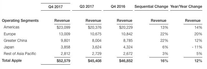 今年Q4,苹果在大中华区的营收为98.01亿美元,同比增长12%,环比增长22%。而在上一季度,苹果大中华区的营收同比下降10%,环比下降25%。在全球几大区域中,大中华区成为营收唯一下滑的地区。在这一季度,日本地区的营收成为全球各地区唯一下降的。