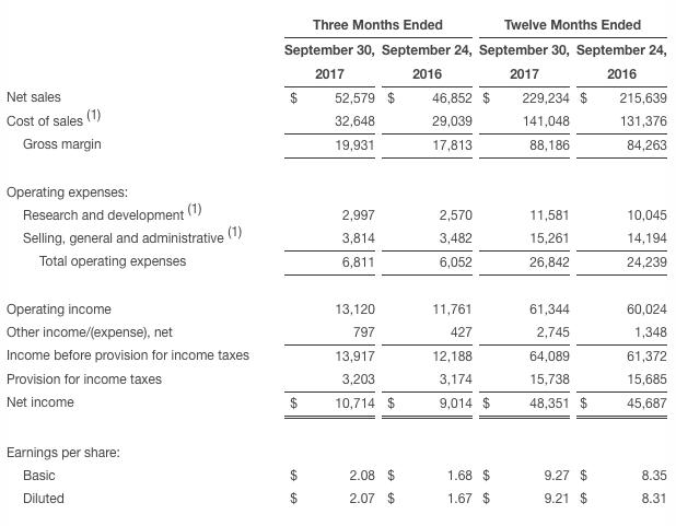 北京时间11月3日凌晨,也就是iPhone X正式开售的日子,苹果发布了2017财年第四季度的财报。数据显示,公司该季度的营收为525.79亿美元,同比增长12%。营收要高于汤森路透此前预期的507亿美元。净利润为107.14亿美元,同比增长18.86%。每股收益(EPS)为2.07美元,同比增长23.95%。EPS要高于汤森路透此前预期的1.87美元。