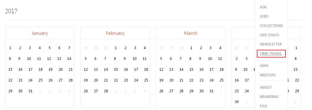 时光回溯。喜欢查看出现在 PH 首页的历史产品的话,PH 官方的 Time Travel 页面将会帮助你查看过去每一天的好产品。