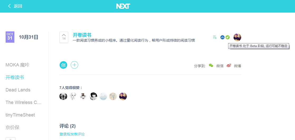 36KR NEXT 在产品展示的页面设计上有不少值得赞赏的小细节,小图标方式展示了新产品适用的平台、是否处于 Beta 阶段、产品提交人员是否已入驻 36KR NEXT。