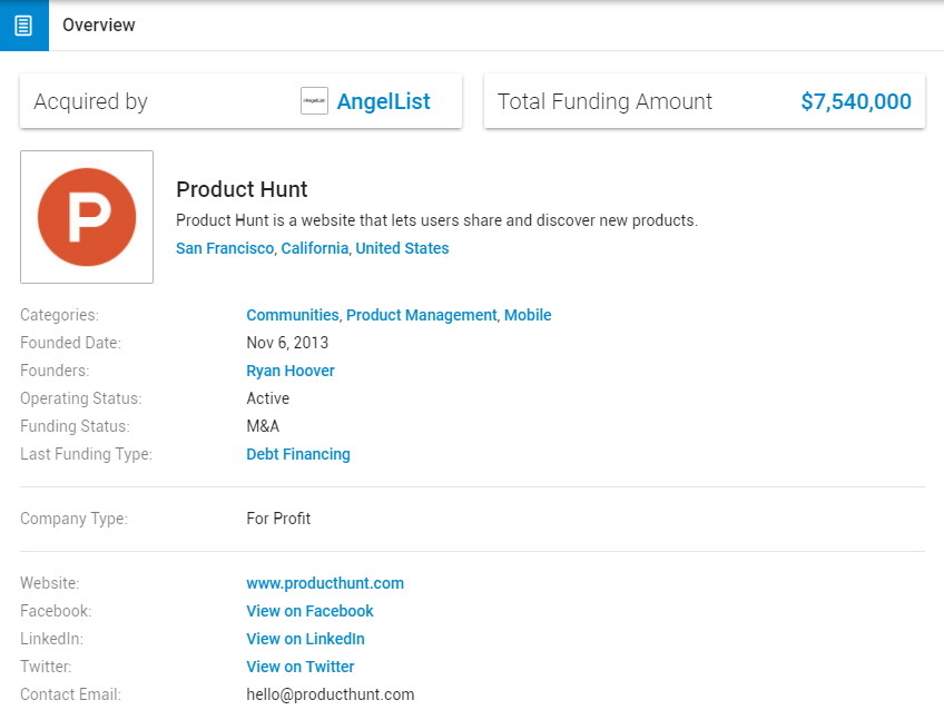 Product Hunt 成立于 2013 年 11 月,由 Ryan Hoover 创立,2014年 7 月加入了著名的硅谷孵化器 Y Combinator,2016 年 12 月被 AngelList 以 2000 万美元收购。