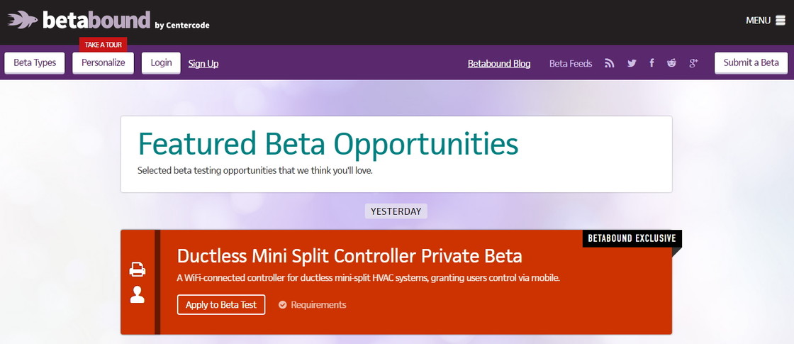 Betabound 号称为各种类型的新产品提供面向公众进行测试展示、招募的平台,Betabound 收录的新品测试资源有其官方独家、合作伙伴推荐以及其他渠道来源,其展示的新产品测试信息分为 Android、iOS、Mac、Windows、Web App、Video Game 软件平台,也有处于 Private、Public 内测和公测环节的新产品。