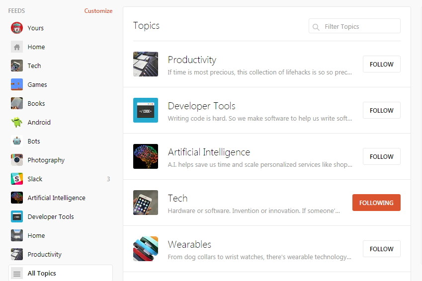 主题订阅。PH 提供了相当丰富的主题类别,每个大的主题类别会有更加细分的小主题分类,帮助用户缩小查找的范围。