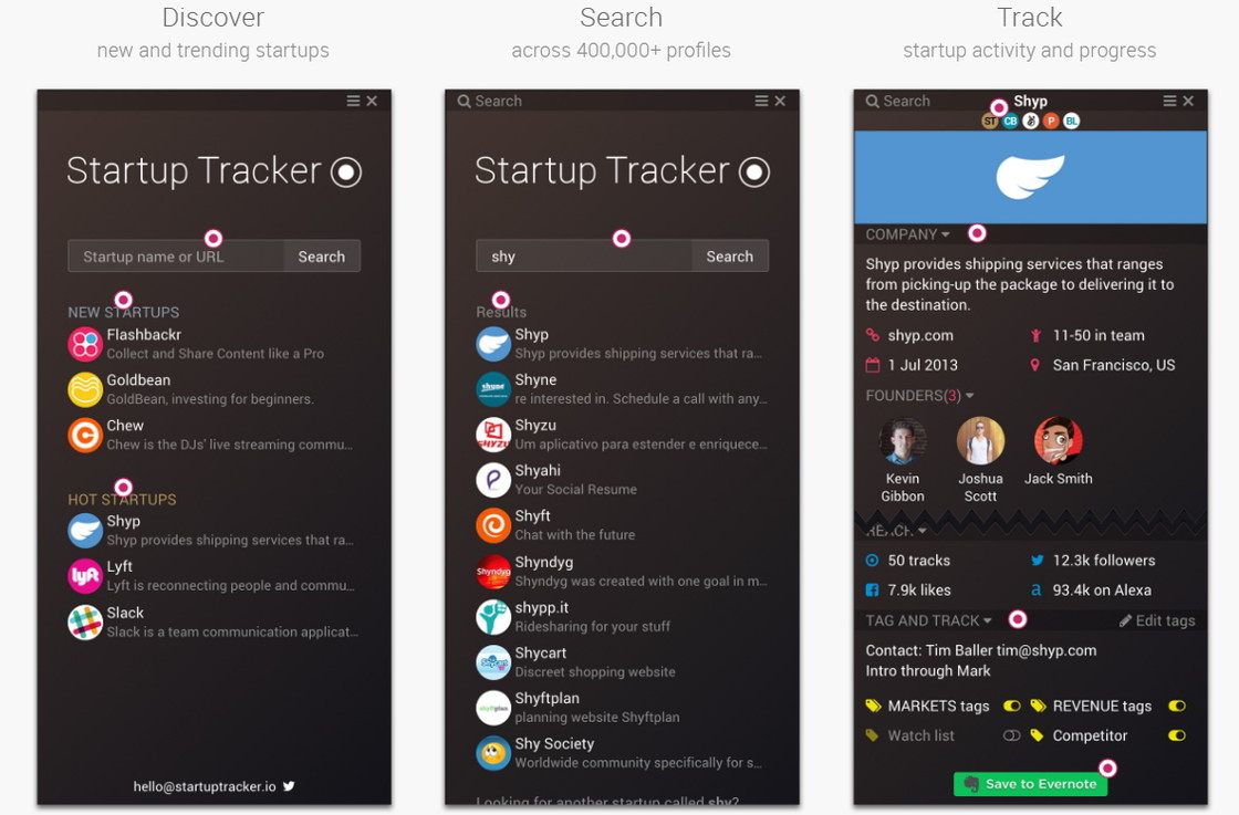 Startup Tracker 是一款浏览器插件,支持 Chrome、Safari、Firefox,安装对应平台的插件之后,用户可以实现查看最新最热门的初创项目,在浏览网页的时候通过划词搜索相关的新产品。在产品展示页面,Startup Tracker 提供了(如果数据库有收录的话)产品开发公司的成立时间、员工数量、创始人、各大社交平台的关注人数、网站的排名、网站的所属标签类别。以上所有信息还支持转存到 Evernote 笔记应用里。