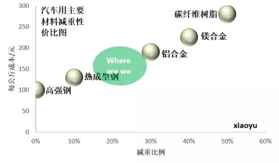 图中可以看到从左到右依次为钢材-热成型钢-铝合金-镁合金-碳纤维树脂,这也是目前市场上较为主流的轻量化解决方案,目前主机厂商轻量化的具体方案大多还是将性价比考虑为首要因素,当然也有一些厂商出于品牌定位的宣传需要,更早的启用了碳纤维树脂等材料,作为车身覆盖件来达到提高起定位的商业目的。