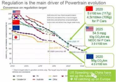 传统车轻量化的需求主要来源于两个方面,油耗和性能。油耗降低本身既是经济和环保两方面受益的事,又是国家规定的2020年百公里5L的考核指标;而另一方面整车的减重也是对整车的加速耐久制动等性能带来增益,根据国际铝业协会的研究结果,整备质量减轻10%,制动距离减少5%,转向力减小6%,行驶稳定性更好。下图为各国CAFE指标走势图。