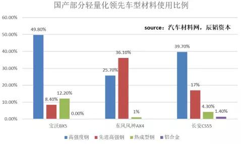 以上数据对比可以得出合资及外资品牌,铝合金和其他高强度钢材应用比例较自主品牌高;而电动车型较传统燃油车型轻量化进度更为激进。整体上行业的轻量化进程符合我们的判断,即正处于高强度钢的大比例使用和热成型钢,铝合金应用比例逐渐提升期间。