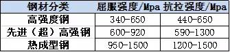 热成型钢。热成型钢其实指得就是热冲压的成型工艺,相对于冷冲压而言,热成型是将特殊的低碳钢板(目前称之为硼钢)加热到900度高温(奥氏体温度以上),然后通过模具成形并急速冷却进而形成强度超高的马氏体组织的成形工艺。简单的讲就是通过热成型工艺,将钢板做薄的同时提升其强度,从而同时达到减重和提升强度的目的。