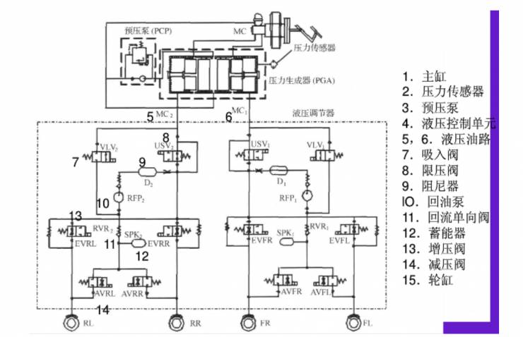 ESP与ABS非常接近,与ABS最大的不同在于ESP可以在没有踩刹车踏板的情况下向轮缸输出制动压力,ABS只能在踩下刹车踏板后从主缸向轮缸输出压力。