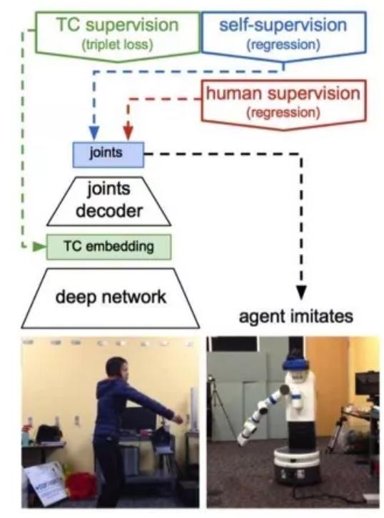 至于如何提取专家动作序列,则和我们分析运动员的动作有些类似。把上帝式的第三人称视角和可以观察到运动主体四周状况的分而论之。可以录制第三人称视角的运动视频,一帧帧的把动作进行聚类,把图像输入到网络,再到机器人的动作关节。又或者把第三人称视角转变成第一人称视角,再将图像信号映射到神经网络之中等等。