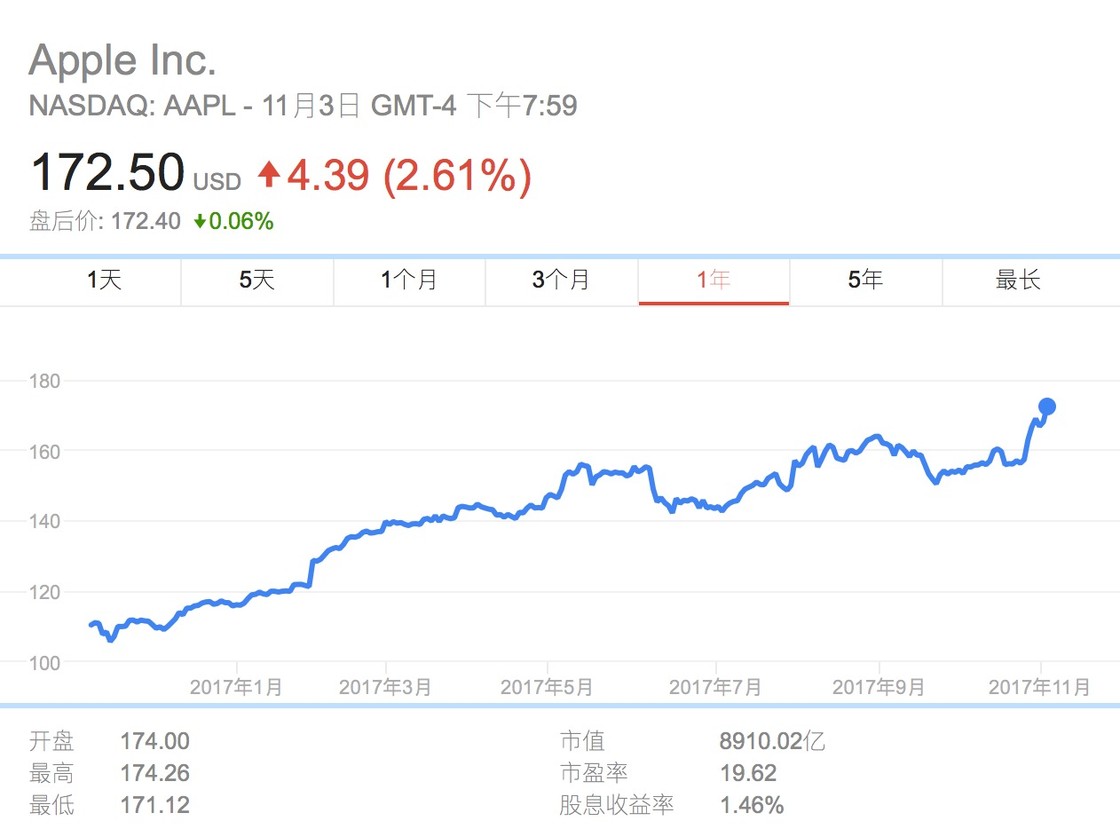 至于每股收益,Apple 本季度达到了 2.07 美元每股,远超 先前华尔街分析师 1.87 美元每股的预测,这让 Apple 的股价在财报放出的当天一下就上涨了 3%。至此,截止 2017 第四季度,Apple 的市值已经达到 9000 亿美元,冲击一万亿美元只是时间问题罢了,说不定就是在下一个季度、把 iPhone X 的销量算进去之后。