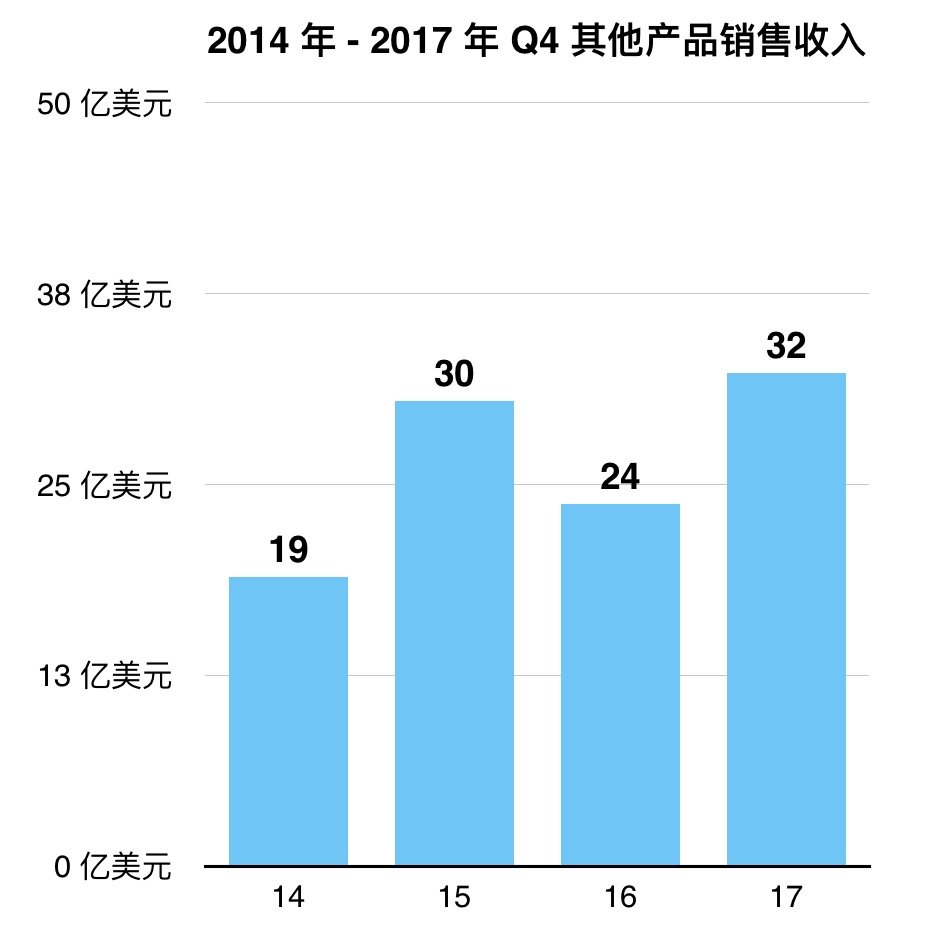 除了服务类之外,包含了 Apple Watch、Apple TV、Beats 产品和第三方配件等产品的其他类在第四季度也收获了 32 亿美元的收入,同比增长 36%、环比增长 18.1%。
