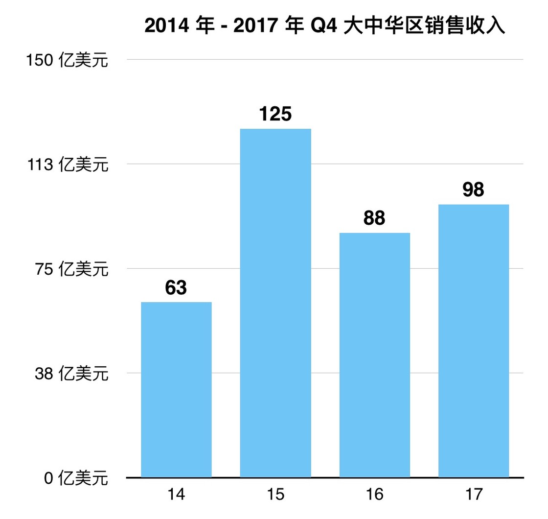 果然,财报发布之后,这一季度 Apple 在大中华区的总营收达到了 98 亿美元,与去年同期相比增长了 11.6%,不过离巅峰的 2015 年(125 亿美元)还是有一段差距的。
