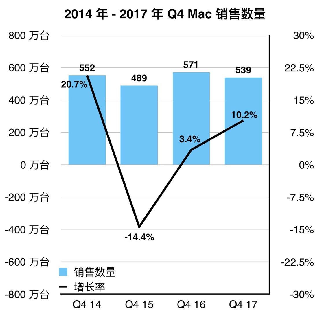 强劲的销售数量增长,再加上 Mac 产品线的提价,2017 年 Q4 Mac 产品线的总营收达到了 71.7 亿美元,创下了 Q4 季度营收的历史性新高。