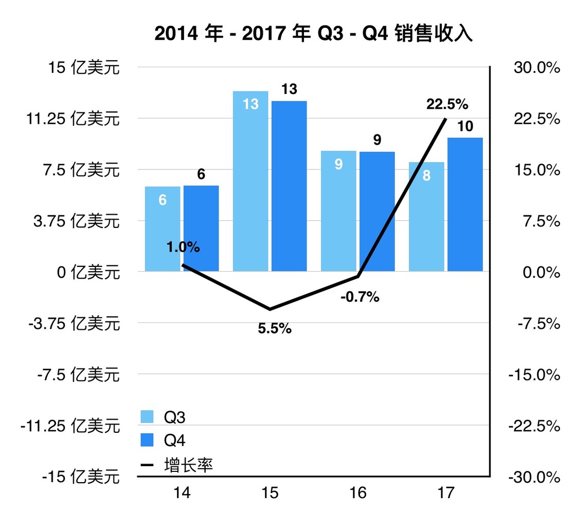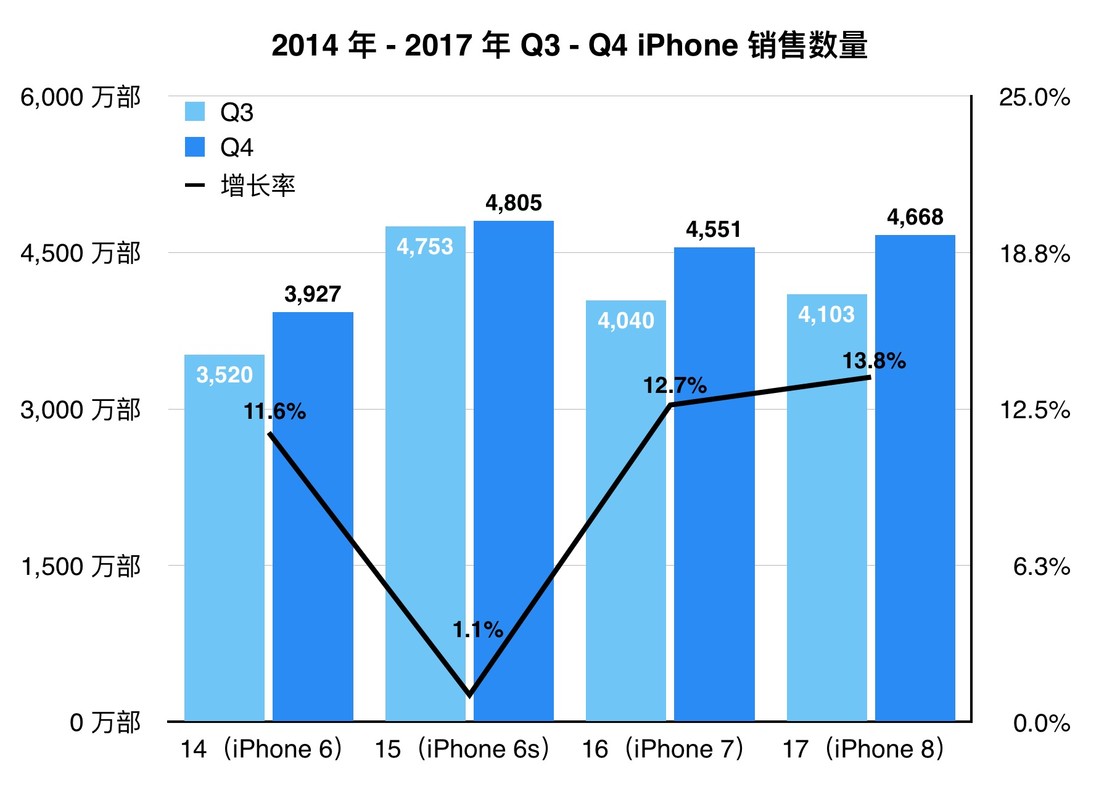 鉴于 Apple 每年固定在秋季召开发布会,所以 Q3 至 Q4 的增长最能说明当年新机型 iPhone 的受欢迎程度,如果我们往前比 3 年,不难看出,此次 iPhone 8 和 8 Plus 的销售数量确实涨幅最大,iPhone 7 和 iPhone 6 的涨幅也都不错,分别是 12.7% 和 11.6%,最惨的就是 iPhone 6 升级到 iPhone 6s 的 2015 年了,相比于 Q3、Q4 只增长了 1.1%。