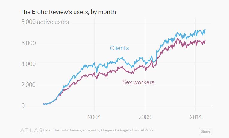 随着评论网站越来越受欢迎,性交易的透明度和可靠性也得到了提升。The Erotic Review等网站的活跃度也反映了市场整体上的增长——更多的性工作者与客户进行更多的接触——因为由于其非法身份,没有可靠的人口普查或性工作者抽样调查。