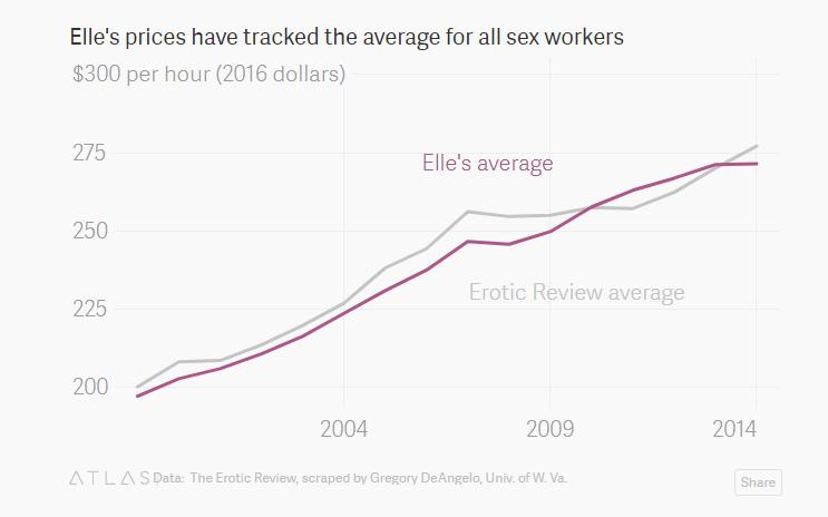 西维吉尼亚大学(University of West Virginia)的经济学家格雷戈里•迪安杰罗(Gregory DeAngelo)从The Erotic Review网站那里搜集了17年的数据,这是一个类似于非法性服务的Yelp(大众点评)网站。该数据集收录了约110万条评论,其中包含了对碰面、时间花费、性工作者特征和价格的极其详细的描述。根据该网站的数据,2000年至2015年间,经通货膨胀调整后的平均小时工资增长了38%。自2000年以来,关于埃莉的评论就出现了,她的价格——现在每小时约为270美元——几乎完全符合美国的平均水平。