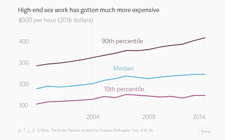 在某种程度上,性交易价格的整体上涨反映了更高的成本,比如在大多数性工作者工作的城市地区,医疗保健和房租上涨。但这似乎也表明了更高的价格涨幅,这是令人惊讶的。你可能会认为,一个能够产生更多竞争和透明度的在线市场会导致更低的利润——就像亚马逊对零售行业所做的那样。毕竟,如果一名性工作者能以200美元的价格获得类似的服务,为什么还要付给性工作者700美元呢?