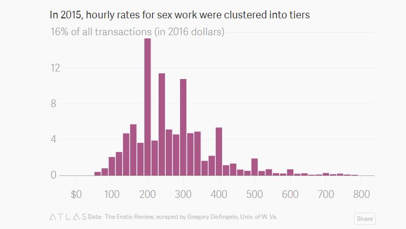 随着市场的增长,不同细分市场出现了不同的价格区间。The Erotic Review的数据揭示了一个多层次的市场,价格会有每小时200美元、250美元和300美元的情况。