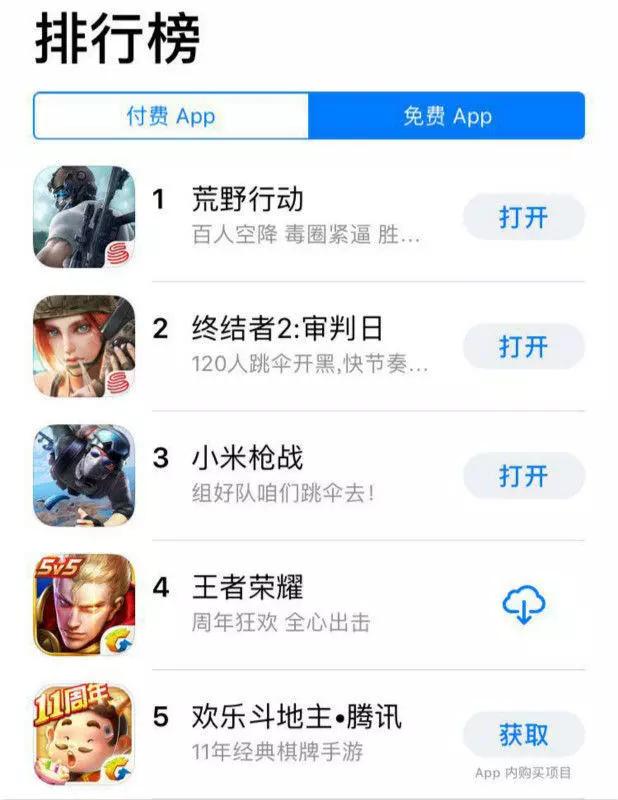 11 月 3 日当天,大厂网易也带着自家的两款「大逃杀」手游《荒野行动》《终结者 2:审判日》杀进战场,没过多久便改写了 App Store 下载榜排名,形成了 Top3《荒野行动》《终结者 2:审判日》《小米枪战》的新格局,坐在头把交椅持续半年的《王者荣耀》旋即到了第四位,它终于不再是「话题之王」。