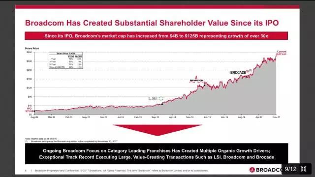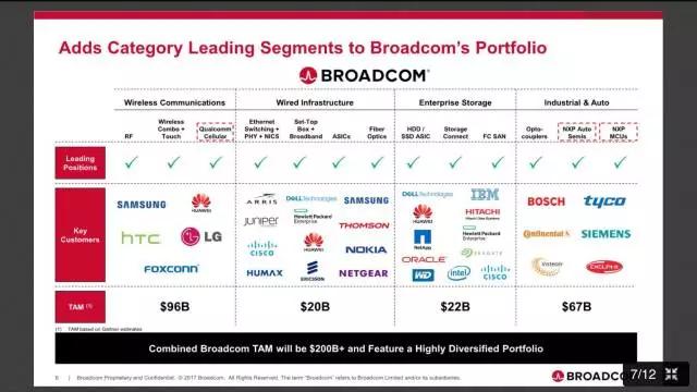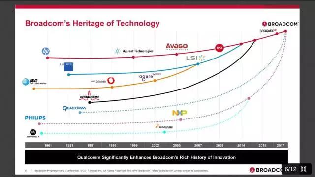 博通公司是全球领先的有线和无线通信半导体公司。其产品实现向家庭、 办公室和移动环境以及在这些环境中传递语音、 数据和多媒体。 而高通公司(Qualcomm),则是世界上最大的手机芯片制造商,其拥有诸多芯片专利,今年以来,高通与苹果陷入了专利拉锯战。