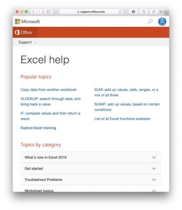 单独的文档门户网页,点击进入后可以查看常见问题解答(FAQ)以及用户指南文档。比如,下图中微软网页的 Excel 帮助页面。