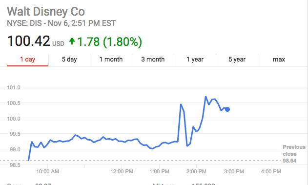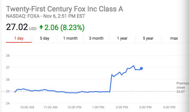 21世纪福克斯股价大涨10%,迪士尼股价涨近2%。