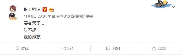 北京时间11月6日夜,柯洁突然在社交网络发了一些十分悲观的话语:“要变天了……对不起 我没能赢”。