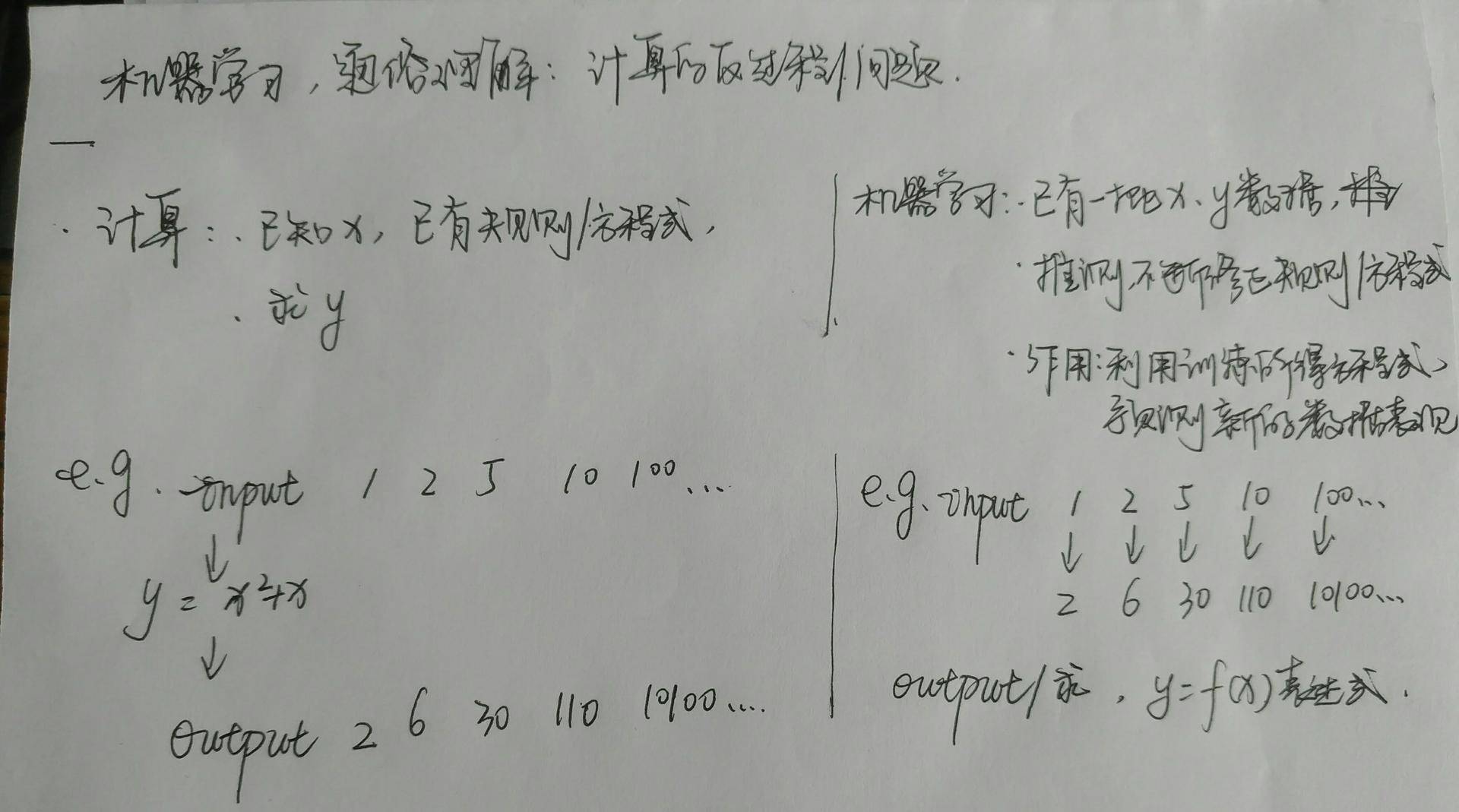 这个“学习”,正是目前人工智能技术领域主流关注的核心。这里涉及一个“机器学习”的专业术语。机器学习是人工智能技术的一种识别模式,相较“数据挖掘”(Data Mining)这个以商业视角来理解人工智能应用的方法,机器学习是以人工智能技术实现层面来定义,这一个术语可以被解释为:计算的相反过程/反问题。这是什么意思呢?计算的正过程是,我们给出一个方程式/规则,然后将数据代入方程式获得计算结果。相反的过程是,我们现在有数据,但是没有方程式,机器要通过数据(训练数据)来给出方程式,然后再走下一步(根据推算的方程式预测新的数据结果)。