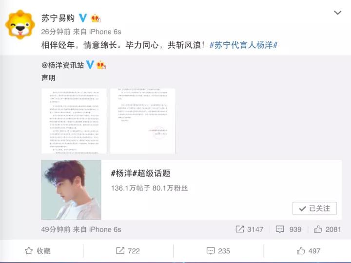 起因是@杨洋资讯站下午发布一条微博,所述内容为“关于京东公司擅用杨洋先生肖像的公开声明”。随后苏宁官微转发附文,“相伴经年,情意绵长。毕力同心,共斩风浪!”并带上#苏宁代言人杨洋#的话题。