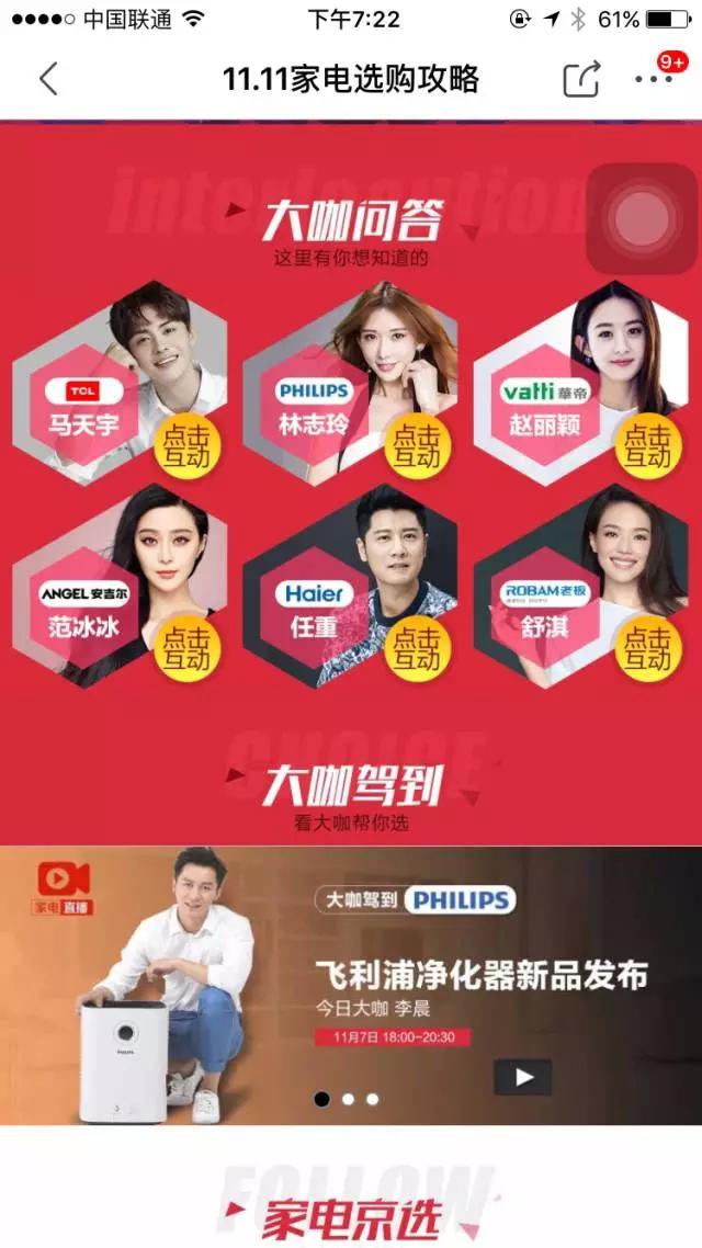 与苏宁死磕一位代言人相比,京东的策略反倒是明星挂靠。以这次双11为例吧,京东在各门类都采用了明星脸作为星推官,比如个护用了小S、鹿晗;家电还弄了个大咖问答,把赵丽颖、范冰冰、林志玲的头像po上去,美其名为解答用户疑惑。(天知道明星们哪里有空给你解答电器问题啦~