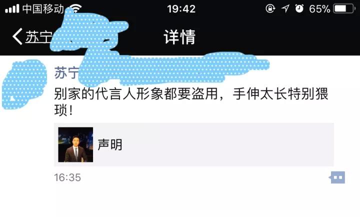 明星资本论(ID:mingxingzibenlun)在朋友圈里发现苏宁某公关总监发了这么一条,“别家的代言人形象都要盗用,手伸太长特别猥琐!”可是,这不就是苏宁作为一个综合电商平台,签明星做代言人的弊端嘛~