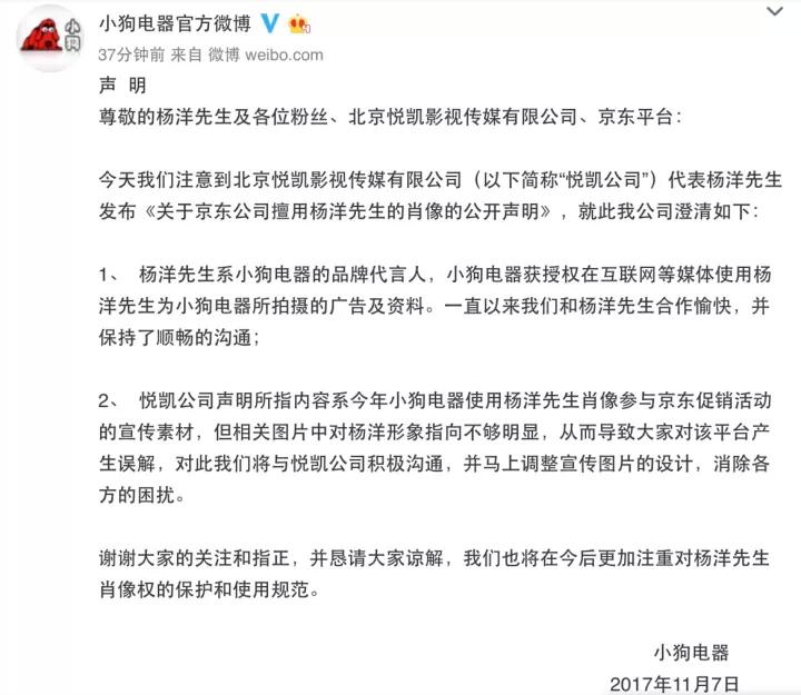 在我们撰稿的同时,小狗电器官方微博也po出澄清声明,先为大家拎出两个重点:第一,此次小狗电器已经获得授权,可以在互联网等媒体使用杨洋的广告图;第二,小狗电器表示“怕怕的”,图片有不妥之处愿意修改。
