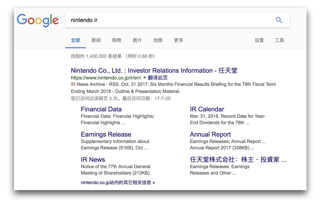 分析一家公司最高效最可靠的手段一定是财务报表,这应该是投资的一个基本前提。搜索Nintendo + IR 即可快速找到公司的对应页面2 。