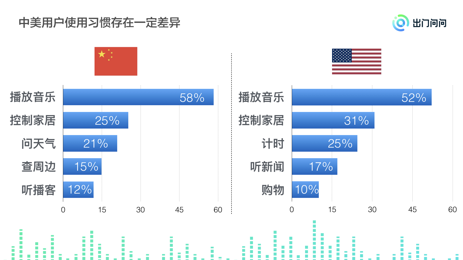 数据显示,出门问问的用户中,已婚用户占53%,这其中,82%的男性有小孩,因此,在家庭场景下,使用音箱播放音乐和控制家居占据了最常使用功能的前两位,分别占58%、占25%。