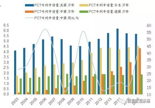 中国PCT专利的申请量已经全球第三,按目前趋势增速可能会在两年内登顶。PCT专利申请量是衡量一国研发能力和创新能力的重要指标。根据WIPO数据,2016年美国、日本、中国专利申请量分别为5.66万件(同比增长-0.9%),4.52万件(同比增长2.6%),4.31万件(同比增长44%)。