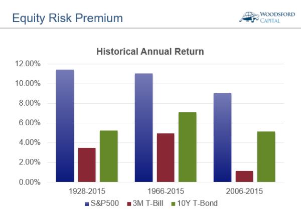 无论在哪个阶段,股票的回报(蓝色)都要远高于短期国债(红色)和十年期债券(绿色)的回报
