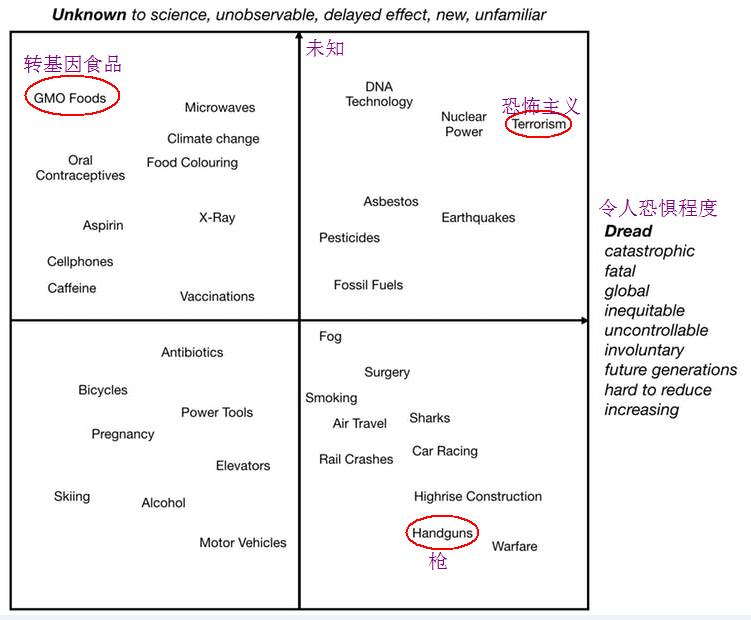 以下的图表显示,恐怖主义在这两个维度的“得分”都很高,枪支只在“恐惧风险”方面得分高,而转基因食品只在“未知风险”上得分高。
