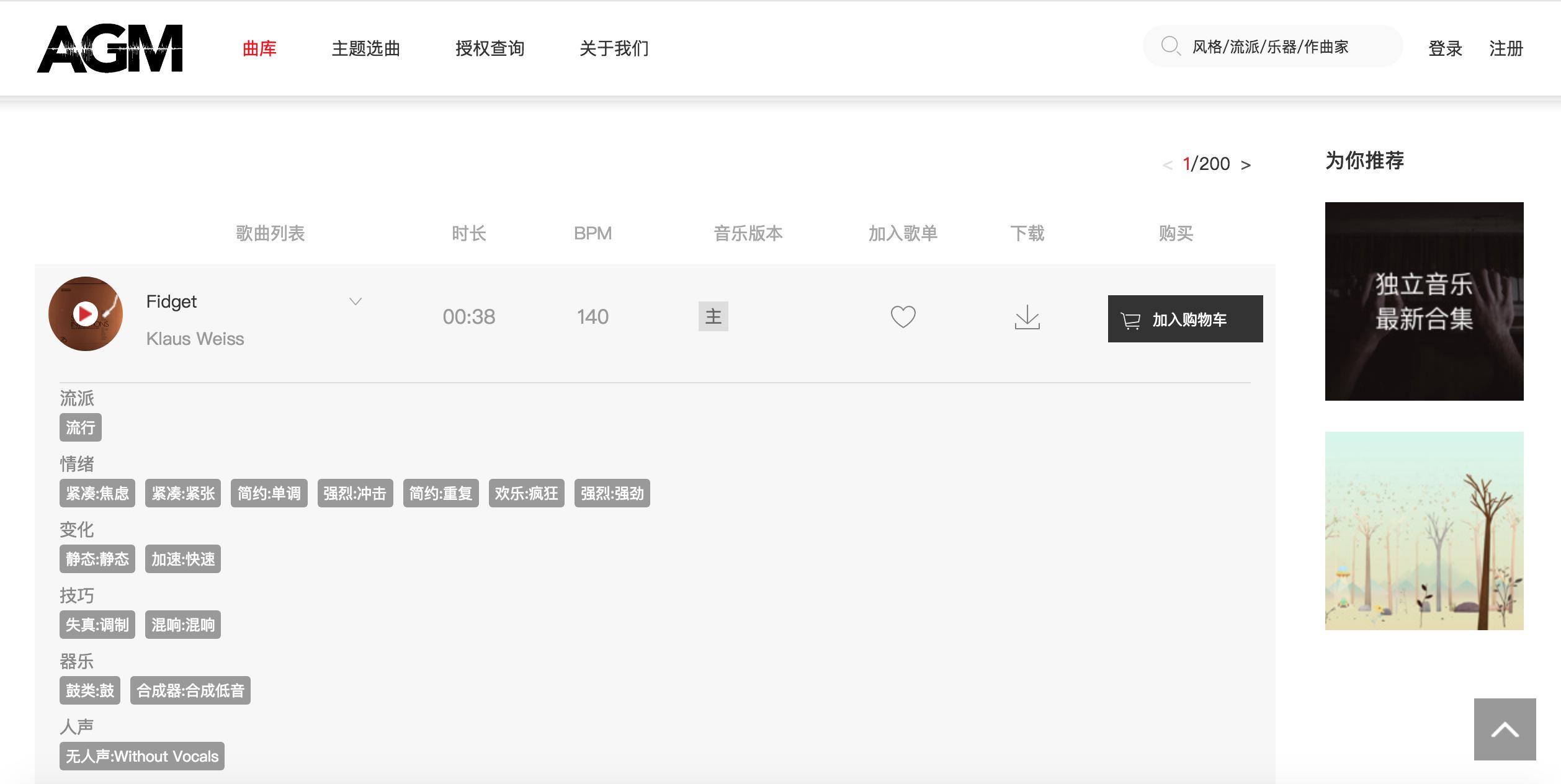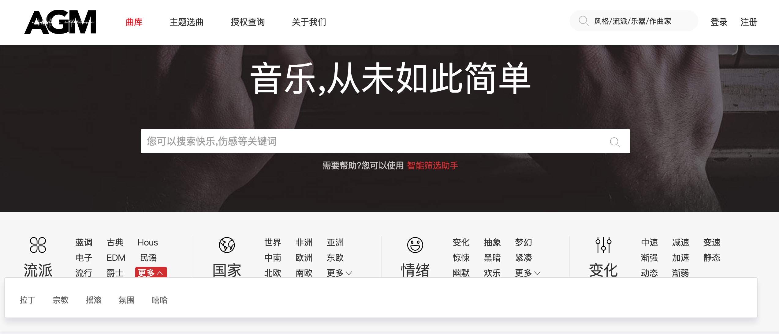 用户可以使用AGM进行智能搜索,在上万个标签分类中简单查询到自己想要的目标歌曲或音乐类型,一站式授权。