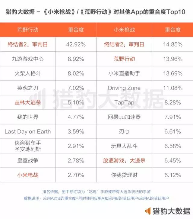 两款游戏与其他App的用户重合度也很有意思,不论是《小米枪战》还是《荒野行动》,与之重合度排名前十的App中,出现了多款“吃鸡”手游。例如在《荒野行动》的重合度排行榜中,此前呼声极高的《丛林大逃杀》也赫然在列。