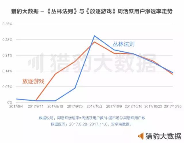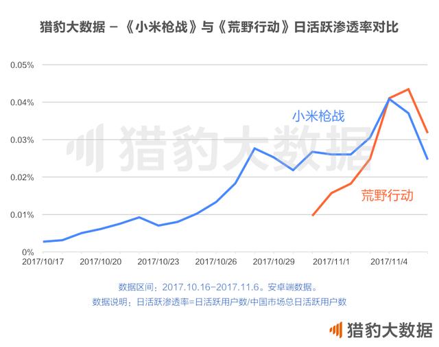 值得注意的是,尽管日活渗透率下跌,《荒野行动》超越《小米枪战》的趋势开始出现。11月4日,《荒野行动》日活渗透率达到了0.0411%,而《小米枪战》为0.0409%,此后《小米枪战》被《荒野行动》反超。