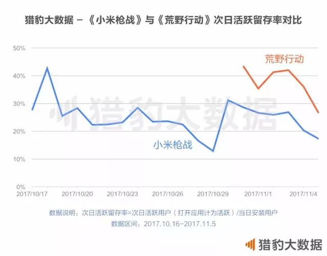 尽管活跃用户总体呈增长趋势,两款游戏的留存率却没有带来太多惊喜。《荒野行动》自上线以来,次日活跃留存率先是维持在40%左右,但近日出现下降趋势,按照留存率的“40–20–10”规则(分别代表日、周、月日活留存率),《荒野行动》的这一留存率刚刚达到及格线。《小米枪战》自10月18日“大逃杀模式”内测以来,次日留存率则几乎都在30%以下。相比之下,《王者荣耀》近一周的次日活跃留存仍维持在40%左右。