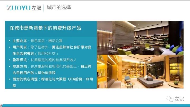 在城市的方向上,精品住宿业面对的更多是社会阶层对品质生活的表达,是一种身份的认同、价值观的体现。因为在城市中有规模化的可能且物业成本较高,所以需用标准化的服务带动用户规模的扩大。在此基础上,要输出符合目标人群的价值观。所有的连锁发展都和数据有关,除了OTA数据之外,其他可能性比如电商,现在万豪和阿里的合作就是一个例子。