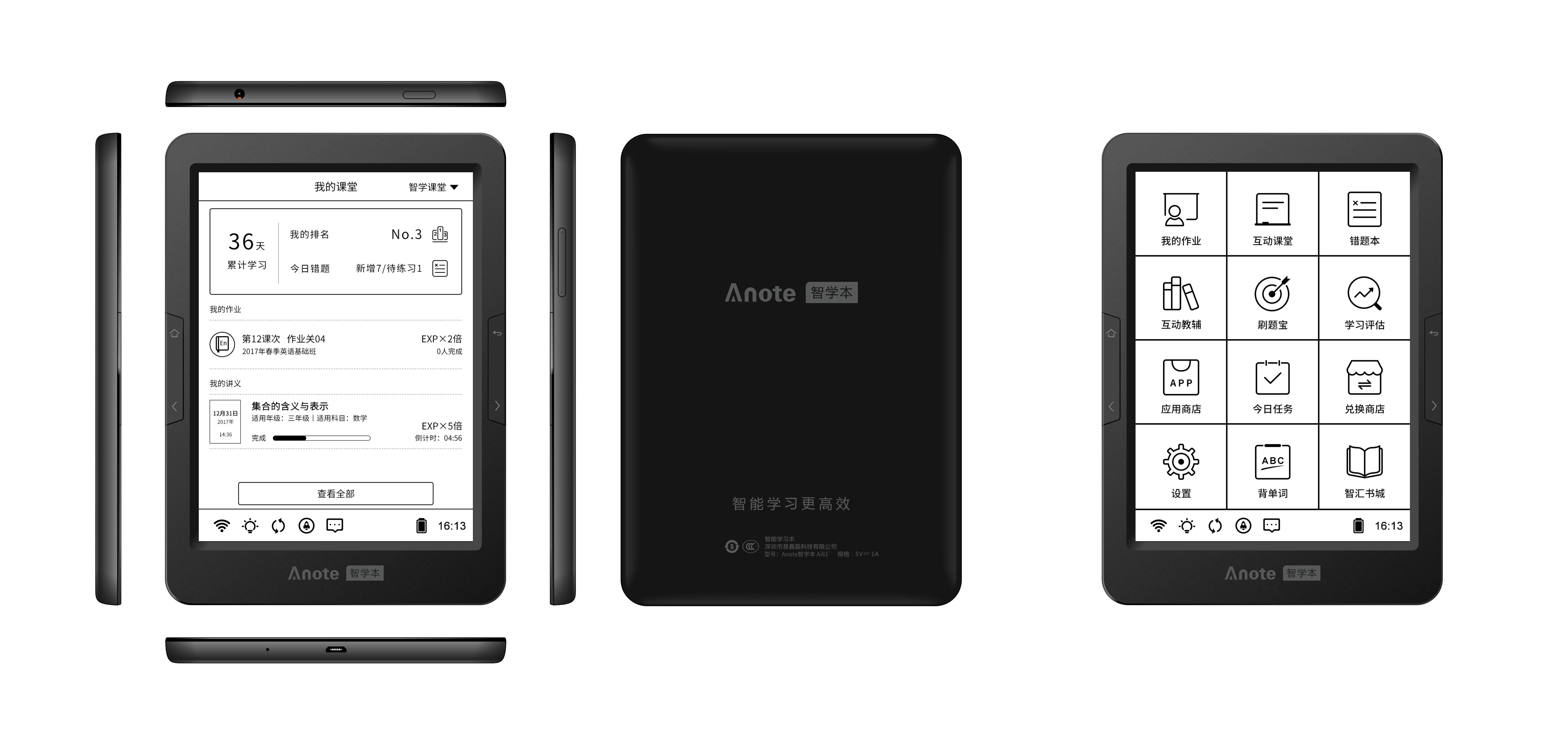 硬件上Anote智学本采用和亚马逊Kindle一样的墨水屏,为保证在暗处可正常阅读,Anote智学本还增加了前光灯设计,并优化解决了刷新闪烁,开机延迟,待机功耗大,学生使用易跌落碎屏等问题。