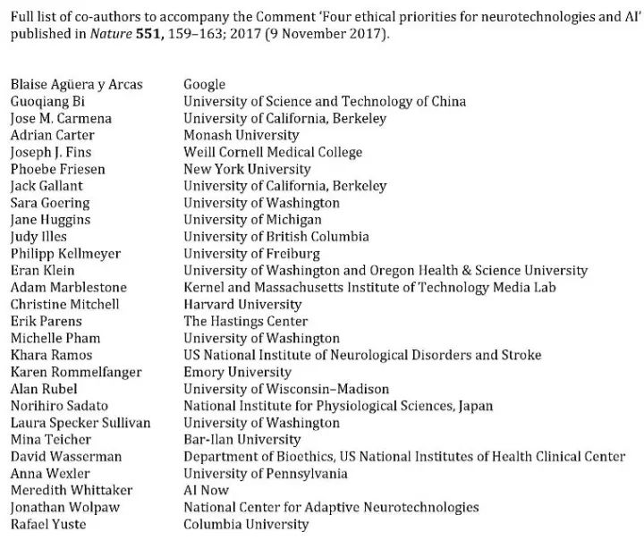 晨边小组(The Morningside Group)由神经科学家、神经技术专家、临床医生、伦理学家和机器情报工程师组成,他们有的来自谷歌和Kernel(一家位于加利福尼亚州洛杉矶市的神经科技初创公司);有的来自国际脑科学项目;有的来自美国、加拿大、欧洲、以色列、中国、日本和澳大利亚的学术和研究机构。