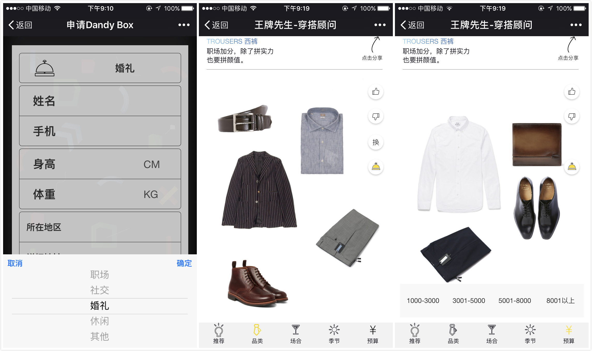 用户在线上提交身高、体重、适用场景等6个数据,系统会自动匹配方案。用户可以在页面上对该搭配点“赞”或“踩”,随着反馈的增加,系统匹配的结果将越来越贴合用户的喜好。选定方案后,用户可以选择把衣服寄到家试穿,满意后下单;也可以选择预约到店,由店里的形象顾问结合智能方案再提出搭配意见。目前「王牌先生」在杭州有两家线下店,明年年初将在商业中心再落地两家体验店。